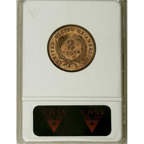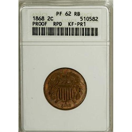<B>1868 2C PR62 Red and Brown ANACS.</B></I> RPD KF-PR1. NGC Census: (3/98). PCGS Population (3/133). Mintage: 600. Numismedia Wsl. Price for NGC/PCGS coin in PR62: $375. (#3637)<BR><BR><B>Coin Engraver:</B> James B. Longacre<BR><BR><b>Shipping:</b> Coins & Currency (<a target="_blank" href="http://www.heritageauctions.com/common/shipping.php">view shipping information</a>)