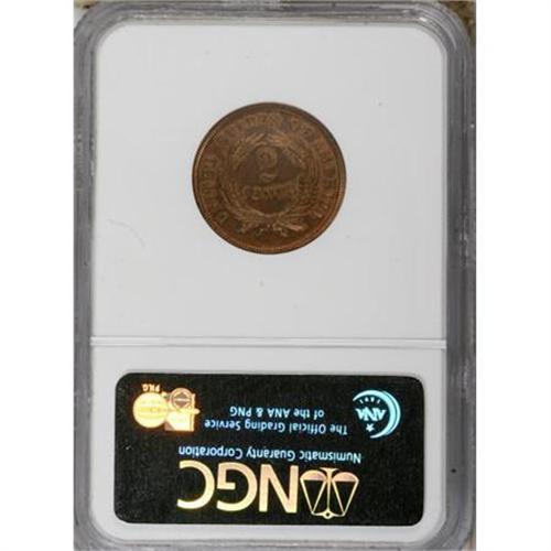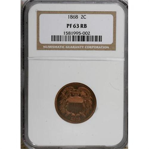 <B>1868 2C PR63 Red and Brown NGC.</B></I> NGC Census: (7/89). PCGS Population (20/113). Mintage: 600. Numismedia Wsl. Price for NGC/PCGS coin in PR63: $420. (#3637)<BR><BR><B>Coin Engraver:</B> James B. Longacre<BR><BR><b>Shipping:</b> Coins & Currency (<a target="_blank" href="http://www.heritageauctions.com/common/shipping.php">view shipping information</a>\)
