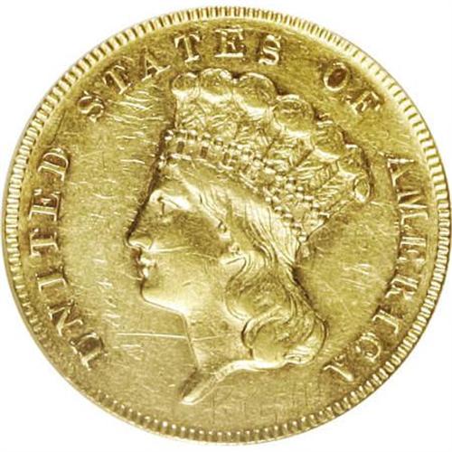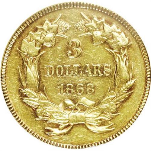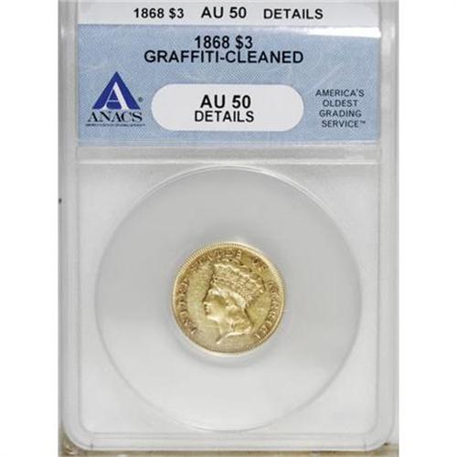 <B>1868 $3 --Cleaned, Graffiti--ANACS. AU50 Details.</B></I> NGC Census: (15/261). PCGS Population (32/187). Mintage: 4,875. Numismedia Wsl. Price for NGC/PCGS coin in AU50: $1,450. (#7989)<BR><BR><B>Coin Engraver:</B> James B. Longacre<BR><BR><b>Shipping:</b> Coins & Currency (<a target="_blank" href="http://www.heritageauctions.com/common/shipping.php">view shipping information</a>)