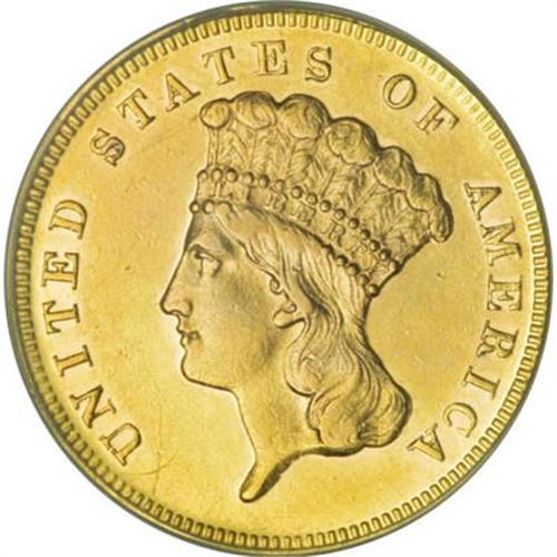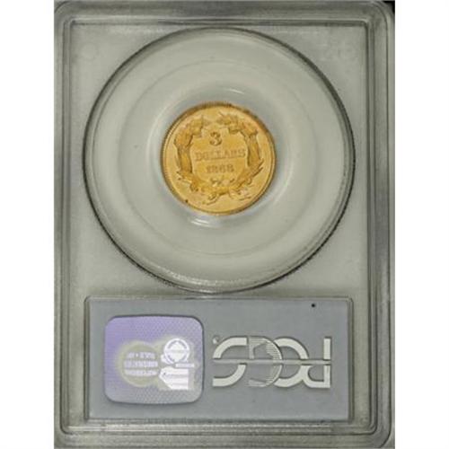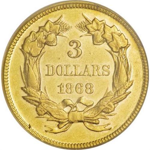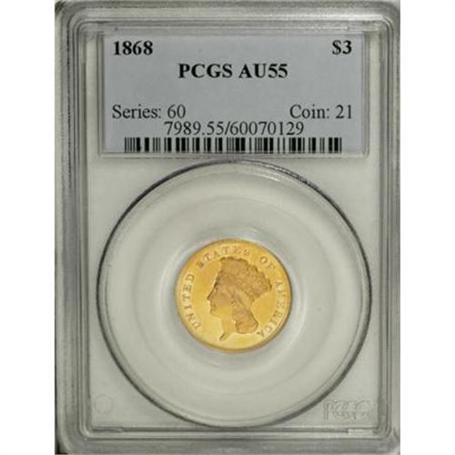 <B>1868 $3 AU55 PCGS.</B></I> A low-mintage, high-survival coin, the 1868 had a production of slightly less than 5,000 business strikes, but 500 or more coins in all grades are certified at NGC and PCGS. This piece offers deep sunset-orange coloration with a few light ticks and abrasions, none of which are singularly mentionable.<BR><BR><B>Coin Engraver:</B> James B. Longacre<BR><BR><b>Shipping:</b> Coins & Currency (<a target="_blank" href="http://www.heritageauctions.com/common/shipping.php">view shipping information</a>)