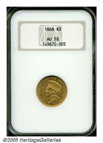 <B>1868<$3> AU58 NGC.</B></I> Lovely example of this tough date, with pearly surfaces, nice luster and no serious flaws despite some light circulation.