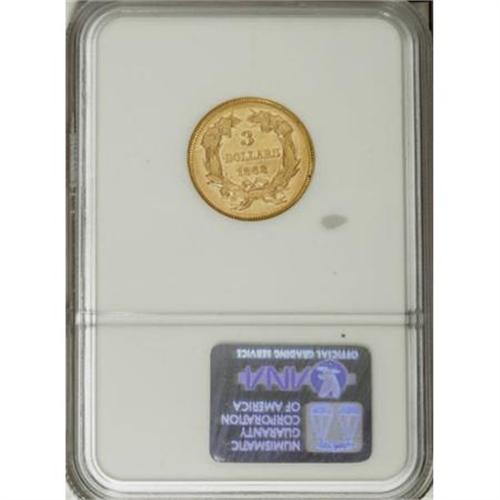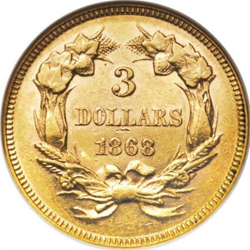 <B>1868 $3 AU58 NGC.</B></I> A high survival rate offsets the 4,850 coin mintage, explaining the availability of 1868 threes. Different die pairs were used for proofs and business strikes, with many of the latter, including this coin, exhibiting prooflike surfaces. Standard die alignment identifies business strikes and medal-turn alignment identifies proofs. Both sides have sharp details, with minor abrasions reflected in the mirrored fields.<BR><BR><I>From The DAX Collection.</B></I><BR><BR><B>Coin Engraver:</B> James B. Longacre<BR><BR><b>Shipping:</b> Coins & Currency (<a target="_blank" href="http://www.heritageauctions.com/common/shipping.php">view shipping information</a>\)