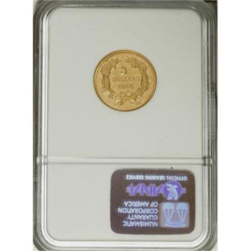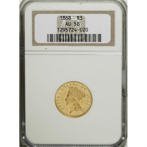<B>1868 $3 AU58 NGC.</B></I> The fields retain most of their reflectivity, despite the slight wear that characterizes this grade. A wholly pleasing and fiercely golden piece that is more appealing than many peer examples. <BR><BR><B>Coin Engraver:</B> James B. Longacre<BR><BR><b>Shipping:</b> Coins & Currency (<a target="_blank" href="http://www.heritageauctions.com/common/shipping.php">view shipping information</a>)