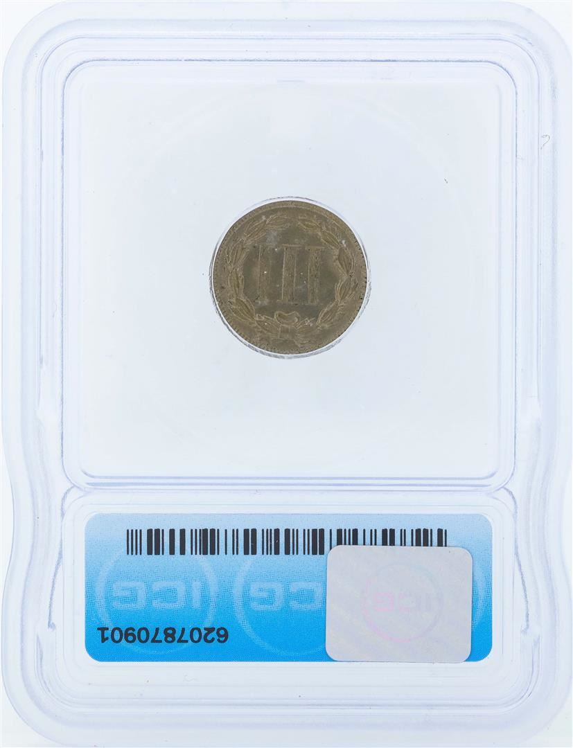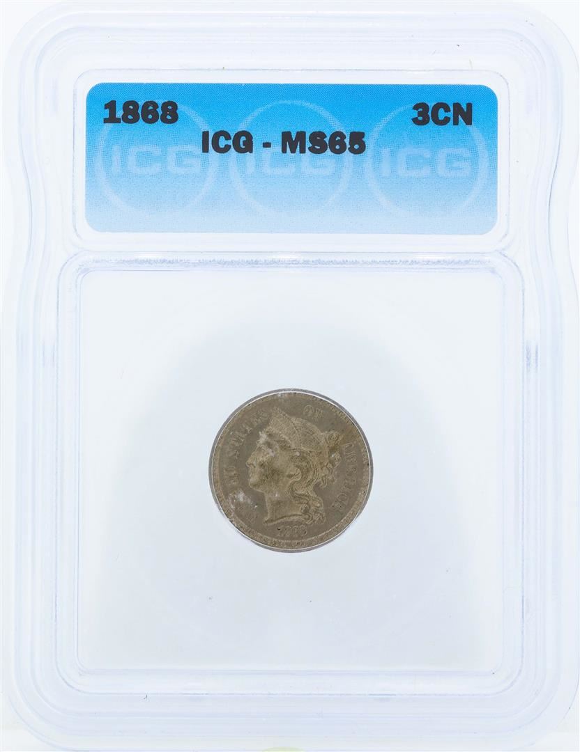 One 1868 3 Cent Silver Nickel Coin ICG MS65. ICG Certified.