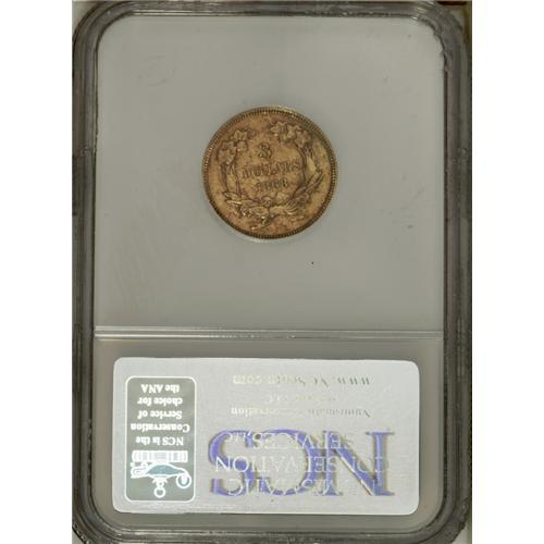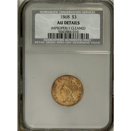<B>1868 $3 --Improperly Cleaned--NCS. AU Details.</B></I> Ruby-red freckles overlie glossy straw-gold fields. Moderately abraded, but a sharp example of this challenging date. A scant 4,825 pieces were issued.<BR><BR><b>Shipping:</b> Coin/Currency (<a target="_blank" href="http://www.heritageauctions.com/common/shipping.php">view shipping information</a>)