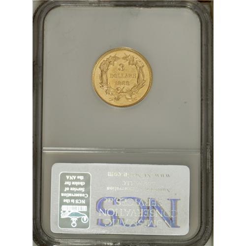 <B>1868 $3 --Improperly Cleaned--NCS. Unc. Details.</B></I> A sharply struck and mildly glossy example that reveals light obverse hairlines once viewed beneath a loupe. Only 4,850 pieces were struck.<BR><BR><b>Shipping:</b> Coin/Currency (<a target="_blank" href="http://www.heritageauctions.com/common/shipping.php">view shipping information</a>)