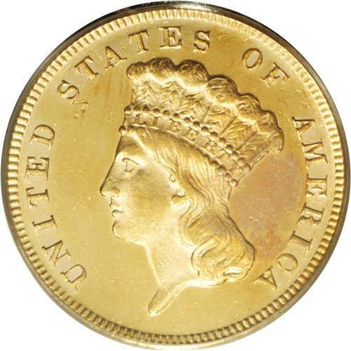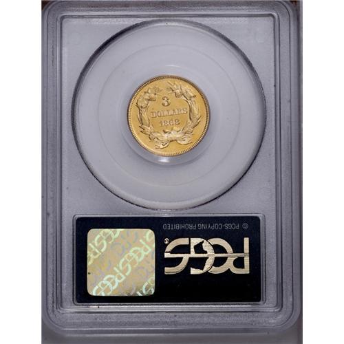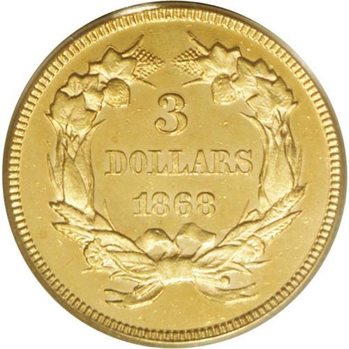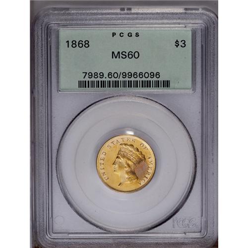 <B>1868 $3 MS60 PCGS.</B></I> A nice looking piece that shows richly toned fields and frosty golden shades on the devices, that provides an attractive contrast. The devices are sharp, but a group of marks is seen in the right obverse field under a small area of lilac-blue color. Just 4,875 pieces including proofs were minted of this date and it is quite elusive at the MS60 level.