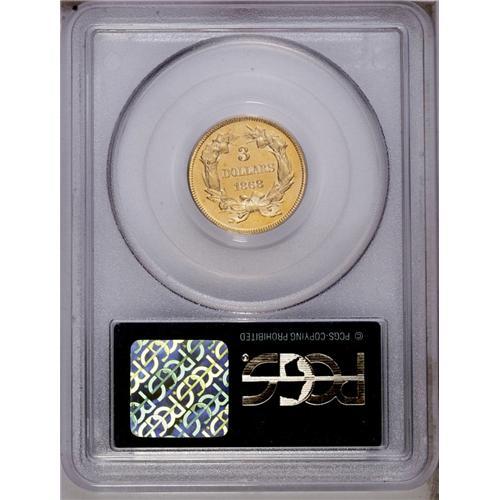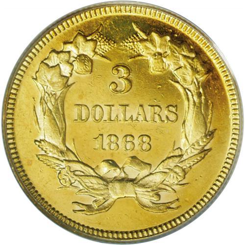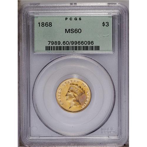 <B>1868<$3> MS60 PCGS.</B></I> Another scarce issue even by the scant standards of the three dollar series, this one with an emission of only 4,850 business strikes. This example has sunset-gold surfaces with touches of hazel. There is no wear, but the highly lustrous, somewhat prooflike fields show myriad small abrasions, with a couple of light scrapes behind Liberty's head, all noticeable only under a strong loupe. A beautiful coin that should represent good value to the successful bidder. <BR><BR><B>Important notice:</B> Heritage usually auctions material at the rate of 200-250 lots per hour. On some occasions eBay Live bid software or the Internet may not be able to keep up with the pace of the auction. We recommend placing a realistic absentee bid now as insurance to avoid disappointment. Occasionally the auctioneer may eliminate or reject an eBay Live bid, and the auctioneer may also reopen a lot after the close of the eBay live bidding (usually because we missed an audience bid), and may reject your bid even if it shows you as the winning bidder. By bidding via eBay Live, you agree that Heritage may award the lot to another bidder at its sole discretion under the circumstances described above or any other reasonable circumstances. Since eBay bids are not shown to us until we open the lot on the floor, we treat those bids just like floor bids. In most cases the floor responds before the eBay bid is presented to us, due to Internet lag time, so for consistency we have made it a policy that floor bids are always considered first over tie eBay live bids. Also please note that all Heritage lots purchased through eBay Live carry a 20% Buyer's Premium. Please make sure you read the Terms and Conditions before you bid. This lot is being auctioned in conjunction with a live floor auction by Heritage Galleries & Auctioneers. All final auction and invoice information will be supplied by Heritage Galleries & Auctioneers, and all other information should be considered preliminary. Lot:2583 <BR><BR><B>Winning Notification and Billing:</B> After the FINAL session in this auction is complete, Heritage will send e-mail and snail mail invoices. This process normally takes several days. All final auction and invoice information will be supplied by Heritage Galleries & Auctioneers, and all other information should be considered preliminary. <BR><BR>This auction will be conducted on a live auction floor and over the Internet through eBay Live. If you choose to place an absentee bid, please take a moment to <font color='#0000ff'><u><a href='http://pages.ebay.com/liveauctions/help/before/laabsentee.html'>learn how eBay Live absentee bidding works</a></u></font><font color='#000000'>