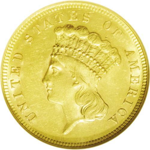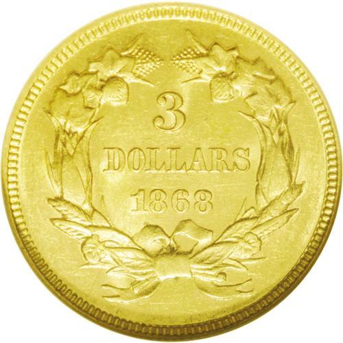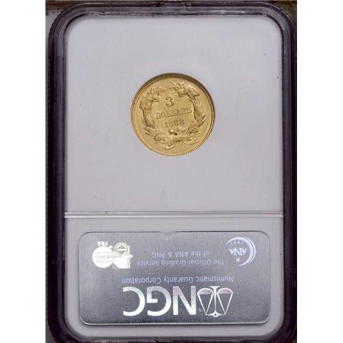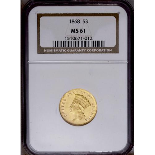 <B>1868<$3> MS61 NGC.</B></I> Mint State examples of this low mintage date are only encountered from time to time; this is an unusual auction event that includes three different Mint State coins. A review of our auction archives indicates that, prior to this sale, we have only handled about two Mint State specimens per year over the past dozen years. This is a fully lustrous and attractive example with pleasing green-gold color and excellent eye appeal. Census: 38 in 61, 42 finer (6/06).
