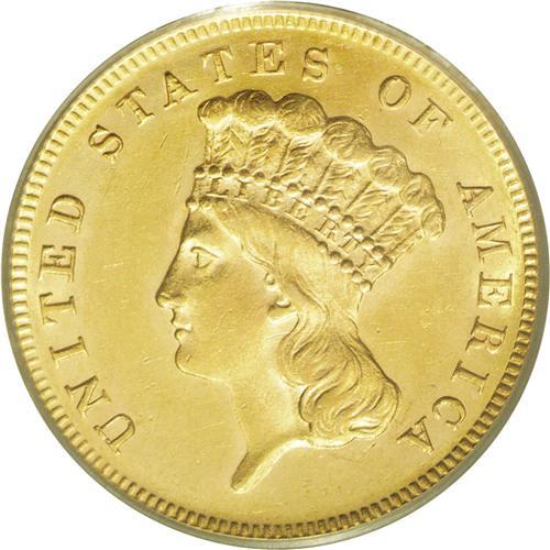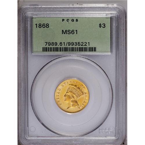 <B>1868<$3> MS61 PCGS.</B></I> This sharply struck and flashy lemon-gold representative has a pleasing appearance to the unaided eye. Thorough inspection beneath a loupe finally locates a few wispy marks on the upper left obverse field that determine the grade. Just 4,850 business strikes were produced, and only a small percentage have survived in Mint State. Certified in a green label holder. Population: 12 in 61, 67 finer (2/06).