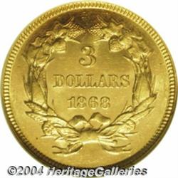 <table><tr><td><table><tr><td>1868 $3 MS62 NGC. One of the more obtainable Three Dollar issues from this decade in Uncirculated grades, although real world scarce from a business strike mintage of 4,850 pieces. Semi-prooflike with decent sharpness and a couple of larger marks to the left of the portrait. <BR><BR><B>Important notice:</B> Heritage usually auctions material at the rate of 200-250 lots per hour. On some occasions eBay Live bid software or the Internet may not be able to keep up with the pace of the auction. We recommend placing a realistic absentee bid now as insurance to avoid disappointment. Occasionally the auctioneer may eliminate or reject an eBay Live bid, and the auctioneer may also reopen a lot after the close of the eBay live bidding (usually because we missed an audience bid), and may reject your bid even if it shows you as the winning bidder. By bidding via eBay Live, you agree that Heritage may award the lot to another bidder at its sole discretion under the circumstances described above or any other reasonable circumstances. Since eBay bids are not shown to us until we open the lot on the floor, we treat those bids just like floor bids. In most cases the floor responds before the eBay bid is presented to us, due to Internet lag time, so for consistency we have made it a policy that floor bids are always considered first over tie eBay live bids. Also please note that all Heritage lots purchased through eBay Live carry a 20% Buyer's Premium. Please make sure you read the Terms and Conditions before you bid. <BR><BR><B>IMPORTANT ANNOUNCEMENT ABOUT RESERVES:</B> Heritage now divulges all reserves on its web site 7 days before every auction. If you want to know whether the reserve on this lot has been met, and if not, what the reserve amount is, please visit this lot page on the HeritageCoin.com web site, or email: bid@HeritageGalleries.com </span></font></td></tr></table></td></tr></table>