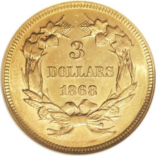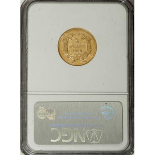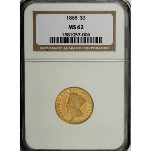 <B>1868 $3 MS62 NGC.</B></I> The low-mintage 1868 three dollar (4,850 circulation strikes) is found mostly in circulated grades, and has perhaps fewer than 100 pieces in Mint State, mostly MS60 to MS62. Peach and yellow-gold lustrous surfaces exhibit sharply struck motifs. A few obverse handling marks preclude a higher grade. Census: 24 in 62, 15 finer (8/07).<BR><I>From The Diemer L. Fife Collection.</B></I><BR><BR><B>Coin Engraver:</B> James B. Longacre<BR><BR><b>Shipping:</b> Coins & Currency (<a target="_blank" href="http://www.heritageauctions.com/common/shipping.php">view shipping information</a>)