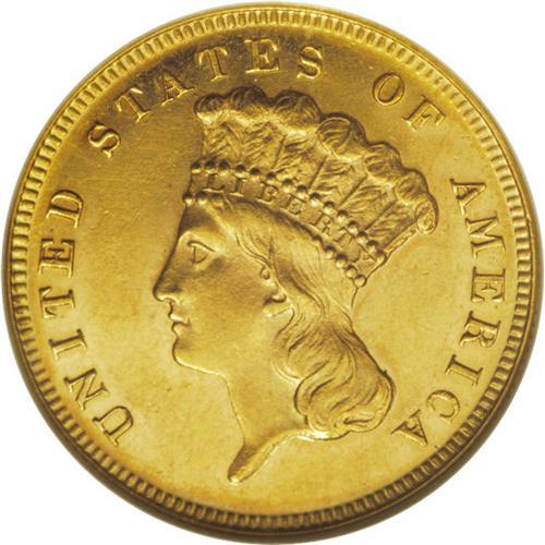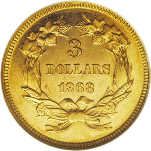 <B>1868 $3 MS62 Prooflike NGC.</B></I> Reflective prooflike fields provide a strong contrast with the mildly frosted motifs. Rich peach-gold color bathes both sides, and a sharp strike has imparted good definition to the design elements. Some inoffensive fine hairlines limit the grade, but there are no mentionable contact marks. A highly pleasing coin overall! The 1868 is from a relatively low mintage of 4,850 business strikes.<BR><BR><b>Shipping:</b> Coins & Currency (<a target="_blank" href="http://www.heritageauctions.com/common/shipping.php">view shipping information</a>)
