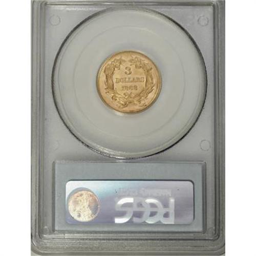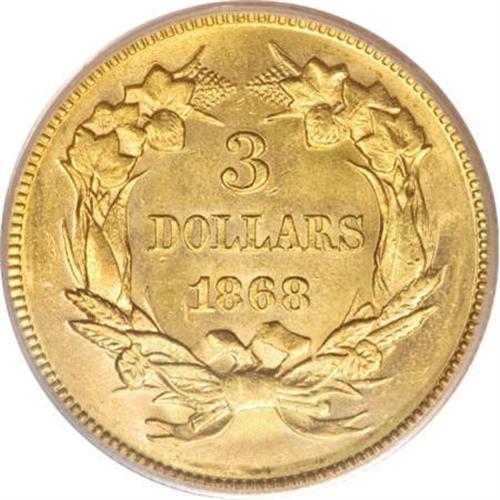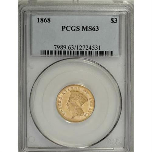 <B>1868 $3 MS63 PCGS.</B></I> Despite its tiny business strike mintage of 4,850 pieces, the 1868 three dollar gold is available for a price. Most collectors, however, will have to settle for a slightly worn example. Others will pursue Mint State coins, but may be disappointed by most pieces on the market; the most heavily populated grade in the Mint State range is MS62, according to the PCGS <I>Population Report</B></I>.<BR> This Select coin offers a distinct step up. The shining yellow-gold surfaces combine reflective margins with swirling luster in the fields. The strike is crisp, and the overall eye appeal is remarkable. While a few small abrasions appear on each side, these are minor when taken individually. Population: 20 in 63, 19 finer (2/08).<BR><BR><B>Coin Engraver:</B> James B. Longacre<BR><BR><b>Shipping:</b> Coins & Currency (<a target="_blank" href="http://www.heritageauctions.com/common/shipping.php">view shipping information</a>)