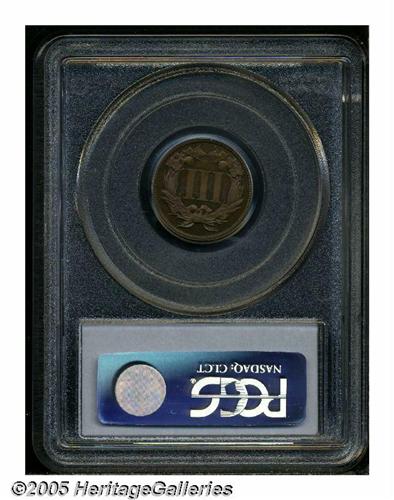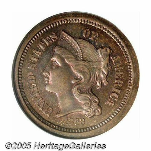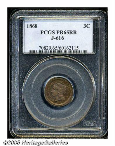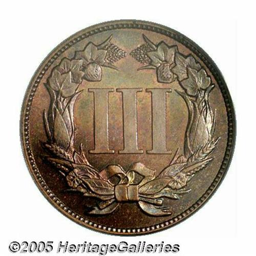 <B>1868<3C> Three Cent Nickel, Judd-616, Pollock-682, High R.6, PR65 Red and Brown PCGS.</B></I> The designs are very similar to the contemporary Three Cent Nickel, however, the denomination is not ribbed and the obverse rim is unusually wide. Struck in copper with a plain edge. Beautifully toned in fire-red, sea-green, and cobalt-blue colors. A well struck and impressive specimen of this scarce pattern.<BR><I>From The Western Hills Collection.</B></I>