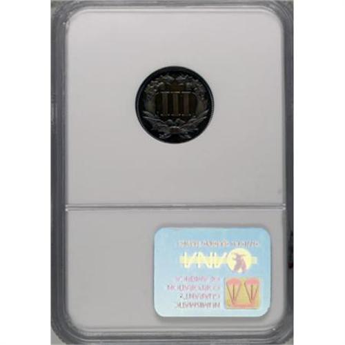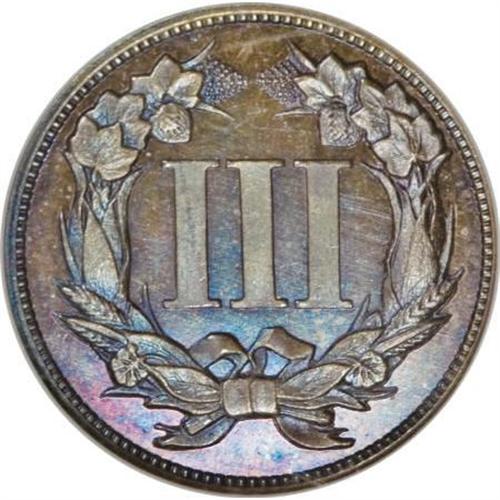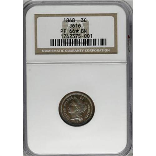 <B>1868 3C Three Cent Nickel, Judd-616, Pollock-682, High R.6, PR66 </B></I> S<B> Brown NGC.</B></I> The obverse is struck from the adopted three cent nickel dies, while on the reverse the Roman numeral III has a smooth surface and is surrounded by a wreath of corn, cotton, wheat, and tobacco. The obverse is set on a cent-sized planchet, leaving that side with extra wide borders, but the reverse looks normal. Struck in copper with a plain edge. Deeply mirrored fields give a pronounced sheen to the deep brown and blue toning that is seen over each side. A magnificent example of this popular and interesting pattern.<BR><BR><b>Shipping:</b> Coins & Currency (<a target="_blank" href="http://www.heritageauctions.com/common/shipping.php">view shipping information</a>)