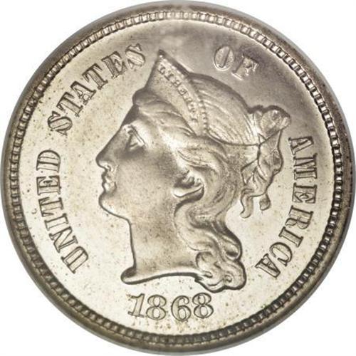 <B>1868 3CN Judd-618, Pollock-687, R.4, PR64 Cameo NGC.</B></I> Similar in design to the contemporary three cent nickel, but the reverse wreath is farther from the rims and the denominational columns are not ribbed. Struck in nickel with a plain edge. Strongly reflective with solid contrast and excellent overall eye appeal. Only a few faint hairlines appear in the fields of this pleasing pattern.<BR><BR><b>Shipping:</b> Coins & Currency (<a target="_blank" href="http://www.heritageauctions.com/common/shipping.php">view shipping information</a>)