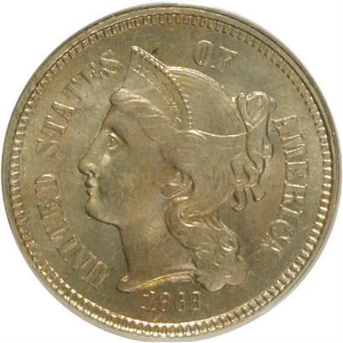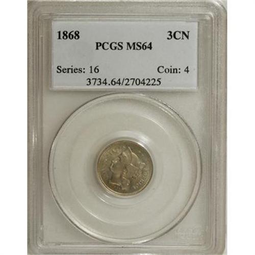 <B>1868 3CN MS64 PCGS.</B></I> PCGS Population (125/83). NGC Census: (158/66). Mintage: 3,252,000. Numismedia Wsl. Price for NGC/PCGS coin in MS64: $208. (#3734)<BR><BR><B>Coin Engraver:</B> James B. Longacre<BR><BR><b>Shipping:</b> Coins & Currency (<a target="_blank" href="http://www.heritageauctions.com/common/shipping.php">view shipping information</a>)