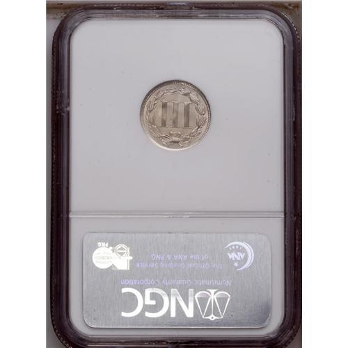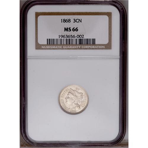 <B>1868<3CN> MS66 NGC.</B></I> A hint of gold toning denies full brilliance, but this lustrous Premium Gem is splendidly preserved. Minor incompleteness of strike on the first two columns and the base of the neck curls, but the devices are generally crisp. Struck from clashed dies. Census: 17 in 66, 2 finer (1/06).