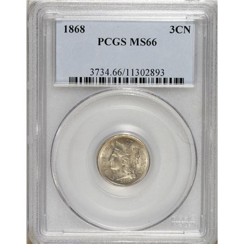 1868 3CN MS66 PCGS. An immaculate and lustrous Premium