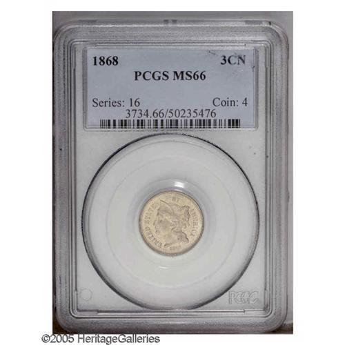 <B>1868<3CN> MS66 PCGS.</B></I> Lustrous surfaces are overlaid by faint specks of gold-tan patina. The design elements are sharply struck, except for weakness in the lines of the central part of the first upright of the III. Population: 21 in 66, 1 finer (12/05).