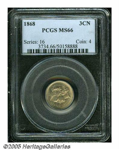<B>1868<3CN> MS66 PCGS.</B></I> More than 3.2 million pieces were struck of this early issue, but relatively few were set aside in lofty grades such as this. Indeed, the combined PCGS and NGC reports indicate only 36 specimens certified in MS66, and just three finer (3/05). The present example has radiant luster and light tan patina which assumes a somewhat streaked appearance. The design elements are exquisitely struck, and the surfaces are devoid of mentionable marks. Population: 19 in 66, 1 finer (3/05).