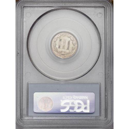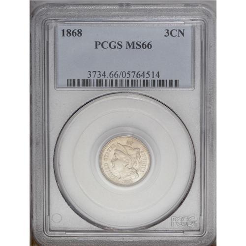 <B>1868<3CN> MS66 PCGS.</B></I> The surfaces exhibit frosty luster and wisps of light tan color. The design elements are generally well impressed, except for weakness in some of the letters of LIBERTY and in the lines of the first two pillars of the III. Light clash marks are noted over each side, both of which are devoid of mentionable abrasions. Population: 22 in 66, 1 finer (2/06).