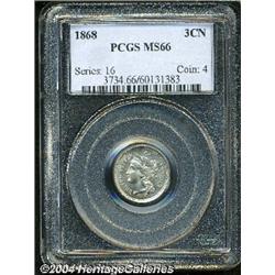 <B>1868<3CN> MS66 PCGS.</B></I> The denomination is not fully brought up, but the portrait, wreath, and legends are crisp. The left obverse field has an interesting retained lamination, as made. Lustrous and beautifully preserved. Struck from boldly clashed dies. Population: 19 in 66, 1 finer (9/04). <BR><BR><B>Important notice:</B> Heritage usually auctions material at the rate of 200-250 lots per hour. On some occasions eBay Live bid software or the Internet may not be able to keep up with the pace of the auction. We recommend placing a realistic absentee bid now as insurance to avoid disappointment. Occasionally the auctioneer may eliminate or reject an eBay Live bid, and the auctioneer may also reopen a lot after the close of the eBay live bidding (usually because we missed an audience bid), and may reject your bid even if it shows you as the winning bidder. By bidding via eBay Live, you agree that Heritage may award the lot to another bidder at its sole discretion under the circumstances described above or any other reasonable circumstances. Since eBay bids are not shown to us until we open the lot on the floor, we treat those bids just like floor bids. In most cases the floor responds before the eBay bid is presented to us, due to Internet lag time, so for consistency we have made it a policy that floor bids are always considered first over tie eBay live bids. Also please note that all Heritage lots purchased through eBay Live carry a 20% Buyer's Premium. Please make sure you read the Terms and Conditions before you bid.