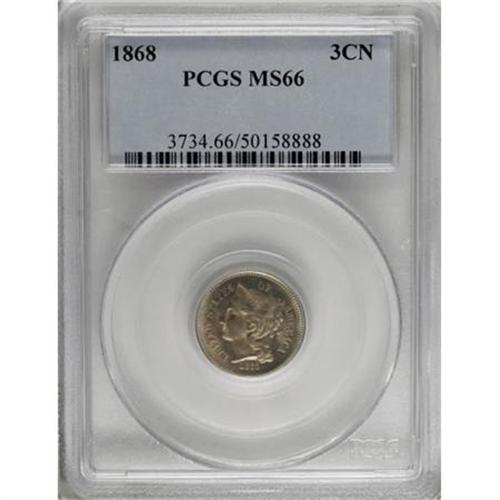 <B>1868 3CN MS66 PCGS.</B></I> More than 3.2 million pieces were struck of this early issue, but relatively few were set aside in lofty grades such as this. The present example has radiant luster and light tan patina which assumes a somewhat streaked appearance. The design elements are exquisitely struck, and the surfaces are devoid of mentionable marks. Population: 27 in 66, 1 finer (8/07).<BR><BR><B>Coin Engraver:</B> James B. Longacre<BR><BR><b>Shipping:</b> Coins & Currency (<a target="_blank" href="http://www.heritageauctions.com/common/shipping.php">view shipping information</a>)