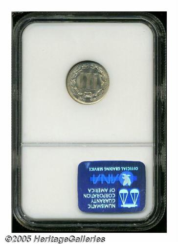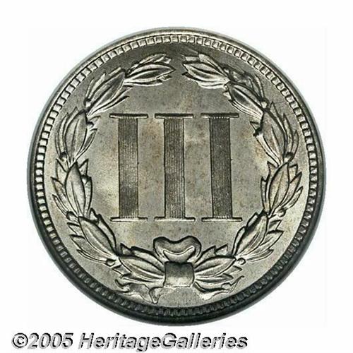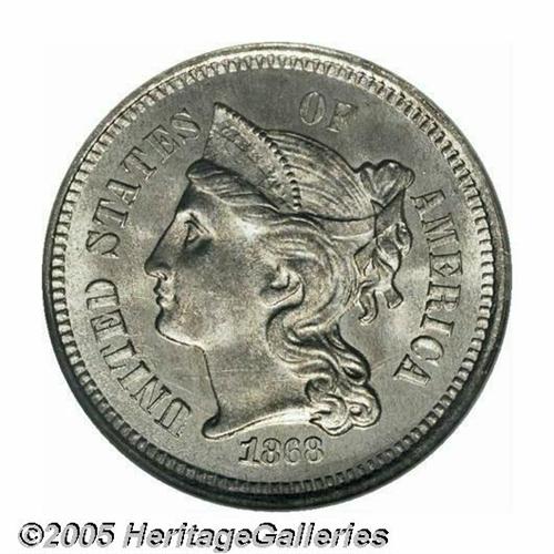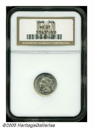 <B>1868<3CN> MS67 NGC.</B></I> Essentially brilliant with luxuriant frosty luster and ample highpoint definition. Subtle evidence of die clashing can be found on the obverse. One of just two MS67s certified by NGC, the other of which sold in our February 2005 Long Beach Sale for an impressive $5,750. Population: 2 in 67, 0 finer (4/05).<BR><I>From The Western Hills Collection.</B></I>