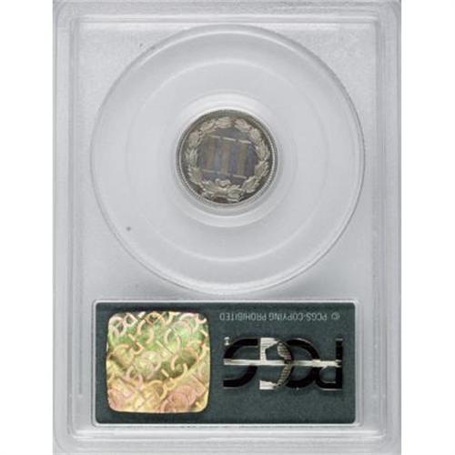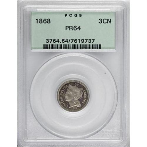 <B>1868 3CN PR64 PCGS.</B></I> A well struck near-Gem with an aquamarine obverse and medium orange-gold, lime, and powder-blue toning on the reverse. The <I>Guide Book</B></I> reports a proof mintage of only 600+ pieces. Housed in a green label holder.<BR><I>From The Vanek Collection.</B></I><BR><BR><b>Shipping:</b> Coins & Currency (<a target="_blank" href="http://www.heritageauctions.com/common/shipping.php">view shipping information</a>)