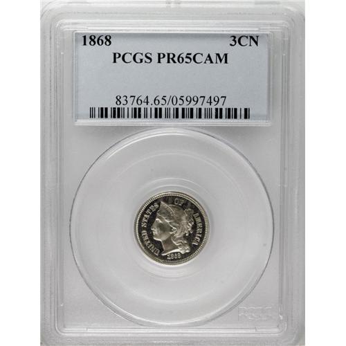 1868 3CN PR65 Cameo PCGS. Minor haze at the top of the