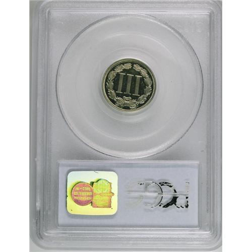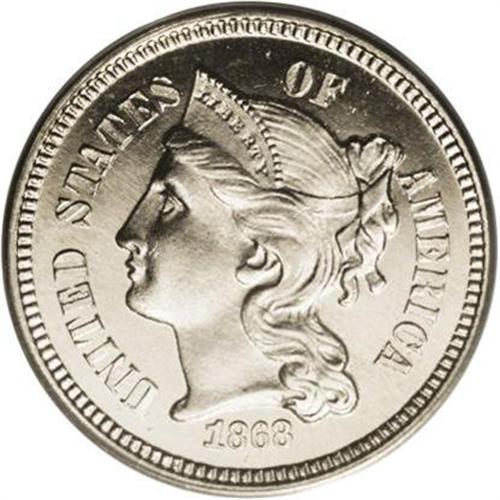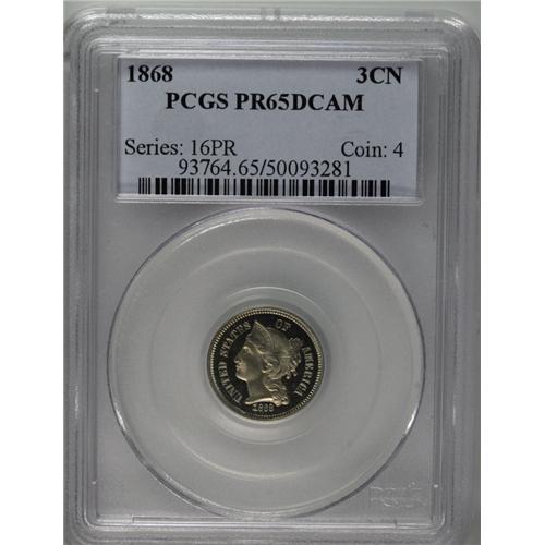 <B>1868<3CN> PR65 Deep Cameo PCGS.</B></I> An untoned and extraordinarily well mirrored specimen that adds a remarkable amount of contrast between the fields and the devices. Early Three Cent Nickel Proofs are rarely found with kind of flash and technical merit. For future identification purposes, a couple of curving lintmarks are seen on Liberty's cheek. Population: 6 in 65 Deep Cameo, 0 finer (8/06).<BR><I>From The Della Collection.</B></I>