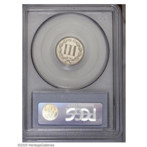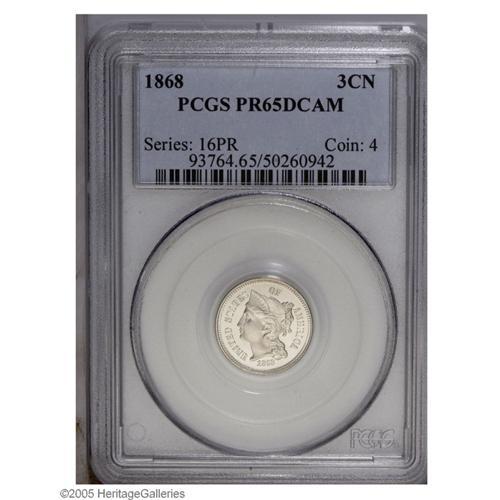 <B>1868<3CN> PR65 Deep Cameo PCGS.</B></I> Outstanding white on black contrast provides imposing eye appeal. This essentially untoned Gem is well struck, as expected for a proof specimen. A few faint roller marks (as produced) cross Liberty's cheek, and a tiny lint mark (as struck) rests in the field area just to the left of her nose. With or without exceptional cameo contrast, the 1868 is one of the scarcest proof issues in the series. Perhaps only the 1865 is more elusive. Population: 6 in 65 Deep Cameo, 0 finer (9/05).