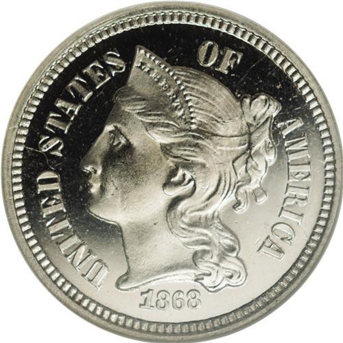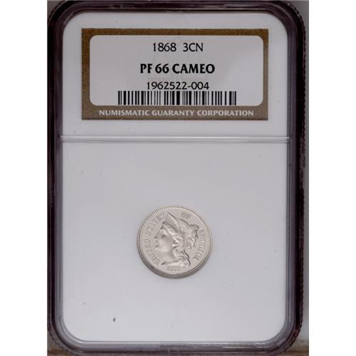 <B>1868<3CN> PR66 Cameo NGC.</B></I> A generally untoned and extraordinarily well mirrored specimen that evens adds nice contrast between the fields and the devices. The design features are exquisitely impressed throughout. A few miniscule marks on Liberty's cheek and neck are mentioned for accuracy. Early Three Cent nickel proofs are rarely found with kind of flash and technical merit. Census: 15 in 66, 8 finer (2/06).