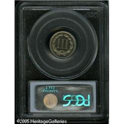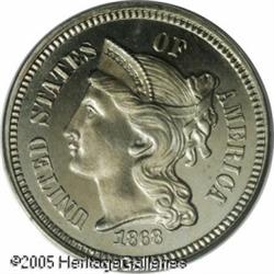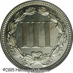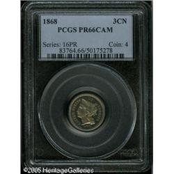 <B>1868 3CN PR66 Cameo PCGS.</B></I> Impressive white on black contrast and well preserved surfaces ensure the eye appeal of this lovely early proof Gem. Faint tan-gold color enlivens each side. The reverse has a pair of curly lintmarks and the dies are slightly rotated clockwise. Population: 7 in 66 Cameo, none finer (10/03). Lot:5782