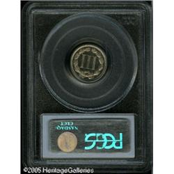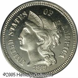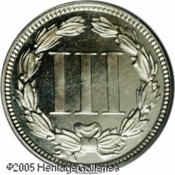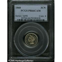 <B>1868 3CN PR66 Cameo PCGS.</B></I> The early Three Cent Nickel coins seldom survive in Gem Proof, and almost never with cameo contrast as seen here. This is a deeply mirrored Gem with frosty devices. Both sides have light nickel-gray coloration with just a trace of pale champagne toning. Parallel drawing lines are visible on the high points of Liberty, and these are as made. Population: 11 in 66, 0 finer (1/05). Lot:5783