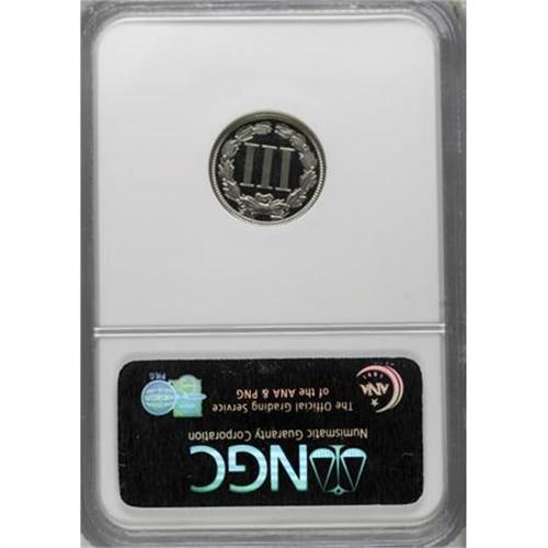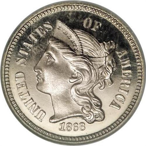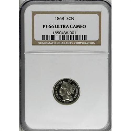<B>1868 3CN PR66 Ultra Cameo NGC.</B></I> Wonderful black-and-white contrast between the fields and the frosty devices characterizes this delightful Premium Gem proof. Well struck aside from faint mint-made roller marks on the central reverse. On the obverse, the letters ICA of AMERICA display the so-called "Longacre doubling" (to use J.T. Stanton's term) found on some coins during this period. Only 600+ pieces were struck. Census: 5 in 66 Ultra Cameo, 1 finer (6/07).<BR><BR><b>Shipping:</b> Coins & Currency (<a target="_blank" href="http://www.heritageauctions.com/common/shipping.php">view shipping information</a>\)