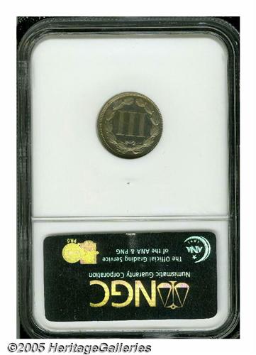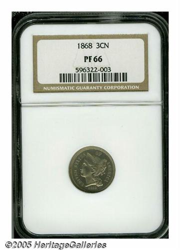 <B>1868<3CN> PR66 NGC.</B></I> Bright proof surfaces reveal a thin veneer of pale tan-gold and light blue patina. The design elements are well struck, and offer a nice contrast against the reflective fields. There are no significant marks worthy of note. As of April 2005, NGC and PCGS combined have certified just 29 pieces, and none finer.