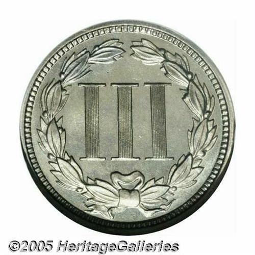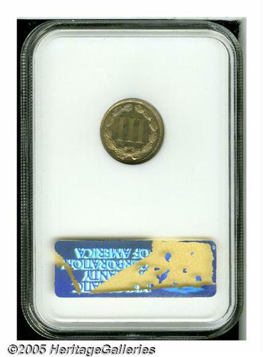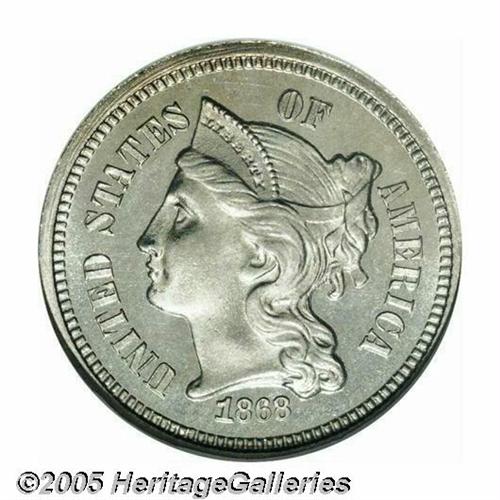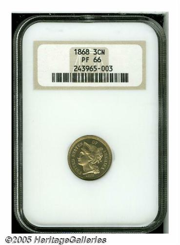 <B>1868<3CN> PR66 NGC.</B></I> Nicely mirrored and free from mentionable carbon, with a smattering of golden-gray patina found primarily on the reverse. Seldom encountered this nice. Population: 22 in 66, 0 finer (4/05).<BR><I>From The Western Hills Collection.</B></I>