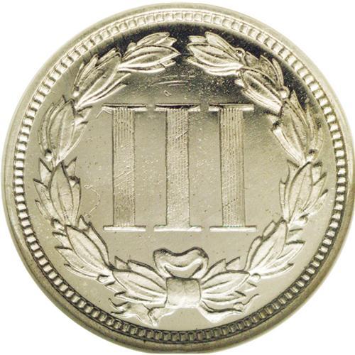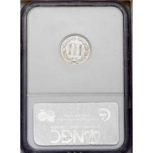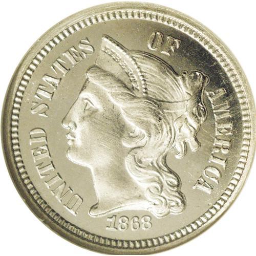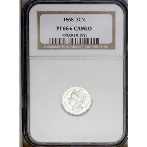 <B>1868<3CN> PR66 <img border='0' src='http://www.heritagecoins.com/images/star.gif' width=10 height=10> Cameo NGC.</B></I> A combination of smooth, brilliant surfaces and obvious white-on-black contrast inspires the <img border='0' src='http://www.heritagecoins.com/images/star.gif' width=10 height=10> designation from NGC. Faint roller marks (as made) in the centers and a few pinpoint carbon flecks deny perfection. Proof three cent nickels from the later years of the series are always available for a price, but proofs from the initial dates of the series are tough to find, particularly in high grades. Census: 2 in 66 <img border='0' src='http://www.heritagecoins.com/images/star.gif' width=10 height=10> Cameo, 8 finer (1/06).