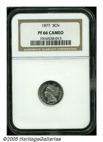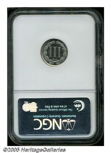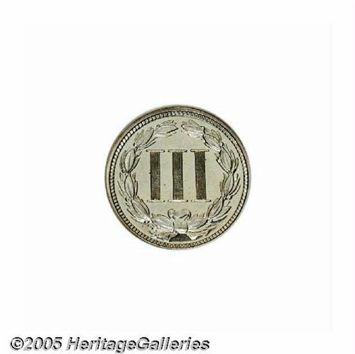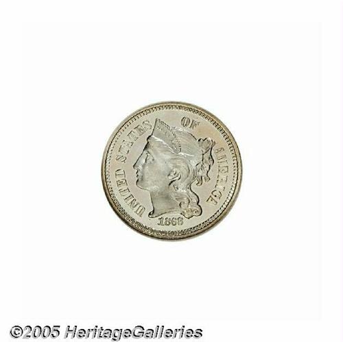 <B>1868<3CN> PR66 <S Cameo NGC.</B></I> A dazzling, faintly toned premium Gem, with unusually deep, glassy mirrors and noticeable striations across the center of the reverse. Population: 8 in 66, 6 finer (6/05).