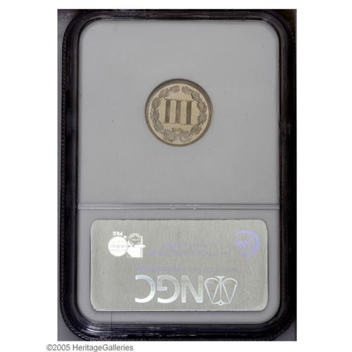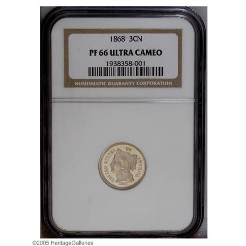 <B>1868<3CN> PR66 Ultra Cameo NGC.</B></I> A lightly toned and extraordinarily well mirrored specimen that has a remarkable amount of contrast between the fields and the devices. Close inspection reveals a series of die file marks on the portrait. A curly lint mark (as struck) resides upon Liberty's neck and hair tresses, beneath the ear. Early three cent nickel proofs are rarely found with this much eye appeal. Population: 3 in 66 Ultra Cameo, 1 finer (10/05).