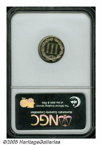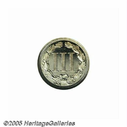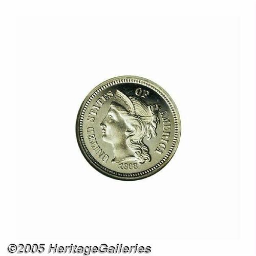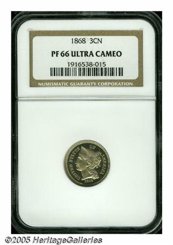 <B>1868<3CN> PR66 Ultra Cameo NGC.</B></I> Light apricot color visits this boldly struck proof Three Cent Nickel. The frosty devices exhibit obvious contrast with the splendidly mirrored fields. Only trivial carbon is present. The 1 in the date is lightly repunched. Population: 1 in 66 Ultra Cameo, 1 finer (6/05).