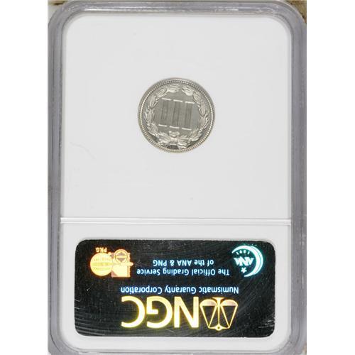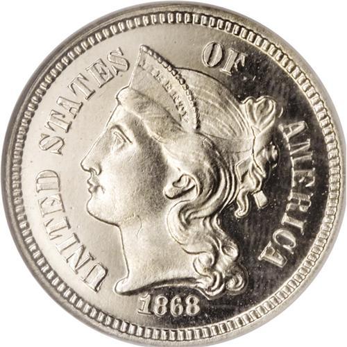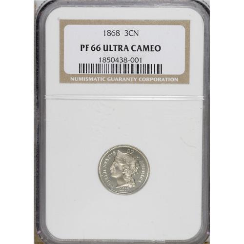 <B>1868 3CN PR66 Ultra Cameo NGC.</B></I> Wonderful black-and-white contrast between the fields and the frosty devices characterizes this breathtaking Premium Gem proof. A couple of wispy lint marks are noted on Liberty's cheek, but otherwise the surfaces are pristine and essentially as struck. On the obverse, the letters ICA of AMERICA display the so-called "Longacre doubling" (to use J.T. Stanton's term) found on some coins during this period. Census: 5 in 66 Ultra Cameo, 1 finer (3/07).<BR><BR><b>Shipping:</b> Coins & Currency (<a target="_blank" href="http://www.heritageauctions.com/common/shipping.php">view shipping information</a>)