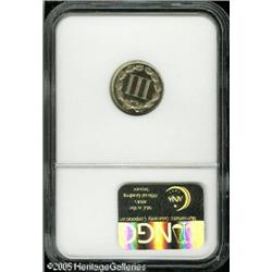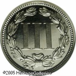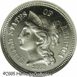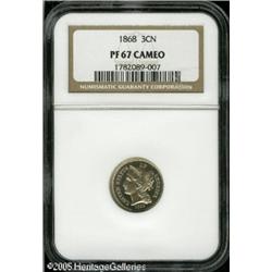 <B>1868 3CN PR67 Cameo NGC.</B></I> A completely untoned and extraordinarily well mirrored specimen that evens adds a touch of contrast between the fields and the devices. Early Three Cent Nickel Proofs are rarely found with kind of flash and technical merit. Population: 6 in 66, 0 finer at either service (1/05).<BR><I>From The Mike Jacobson Collection.</B></I> Lot:5724