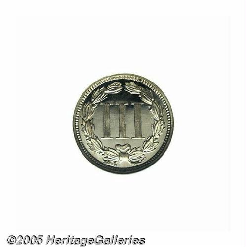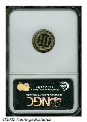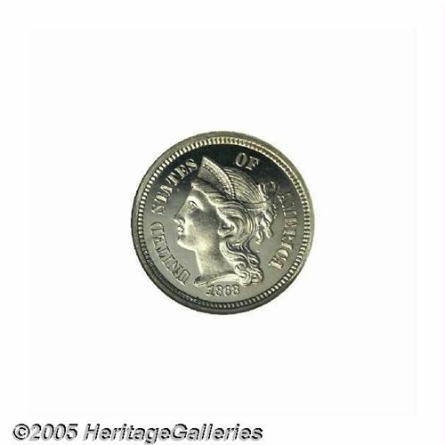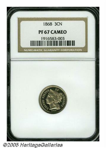<B>1868<3CN> PR67 Cameo NGC.</B></I> An even finer representative that boasts particularly intense glassy brilliance and pinpoint striking details. Several wispy carbon flecks on the portrait have no particular effect on the impressive technical merits. Population: 6 in 67 Cameo, 0 finer (6/05).