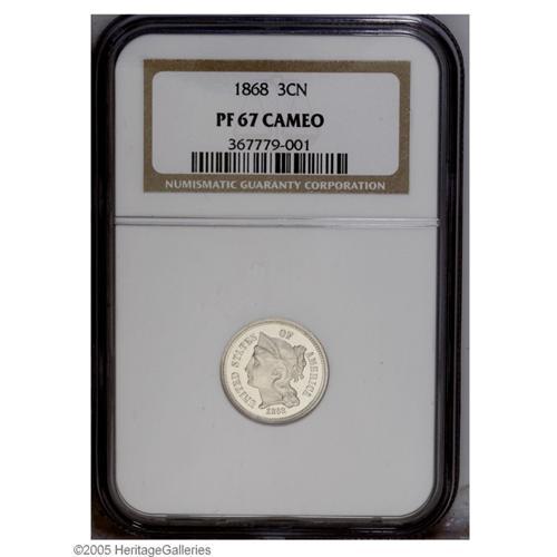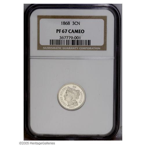 <B>1868<3CN> PR67 Cameo NGC.</B></I> Icy devices contrast with flashy mirrored fields. This suitably struck Superb Gem is fully brilliant and has a fresh from the dies appearance. Although late date proof Three Cent Nickels are readily obtained, the initial dates in the series are much more available in business strike format than as proofs. Population: 8 in 67 Cameo, none finer (9/05).