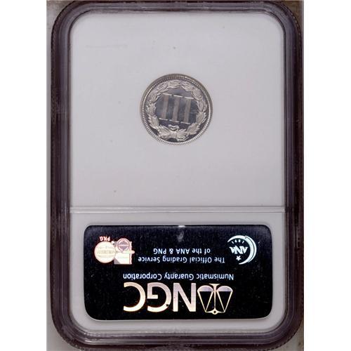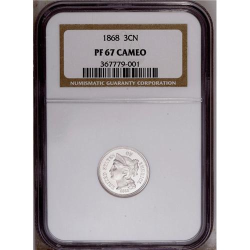 <B>1868<3CN> PR67 Cameo NGC.</B></I> Icy devices contrast with flashy mirrored fields. This suitably struck Superb Gem is fully brilliant and has a fresh from the dies appearance. Although late date proof three cent nickels are readily obtained, the initial dates in the series are much more available in business strike format than as proofs. Census: 8 in 67 Cameo, none are finer (1/06).