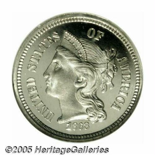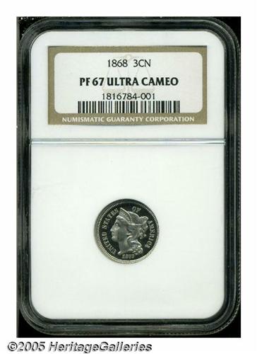 <B>1868<3CN> PR67 Ultra Cameo NGC.</B></I> Outstanding white on black contrast provides imposing eye appeal. Indeed, the devices appear to float over deeply reflective, smooth, watery fields. The surfaces are essentially untoned, and virtually free of any contact marks or carbon spots. A simply outstanding specimen, one of just two specimens to receive an "Ultra Cameo" designation from NGC in all grades. Population: 1 in 67 Ultra Cameo, 0 finer (4/05).<BR><I>From The Western Hills Collection.</B></I>